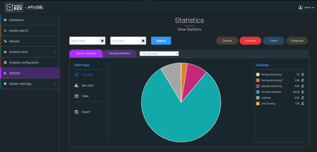 MagicBoxシステムは、解析の設定と検出されたイベントのレビューに使用されるPrasselの独自ソフトウェアインターフェースを搭載しています。ソフトウェアインターフェースの設計はシンプルでユーザーフレンドリーであり、ユーザーが迅速にセキュリティシステムを設定・管理できるようにします。