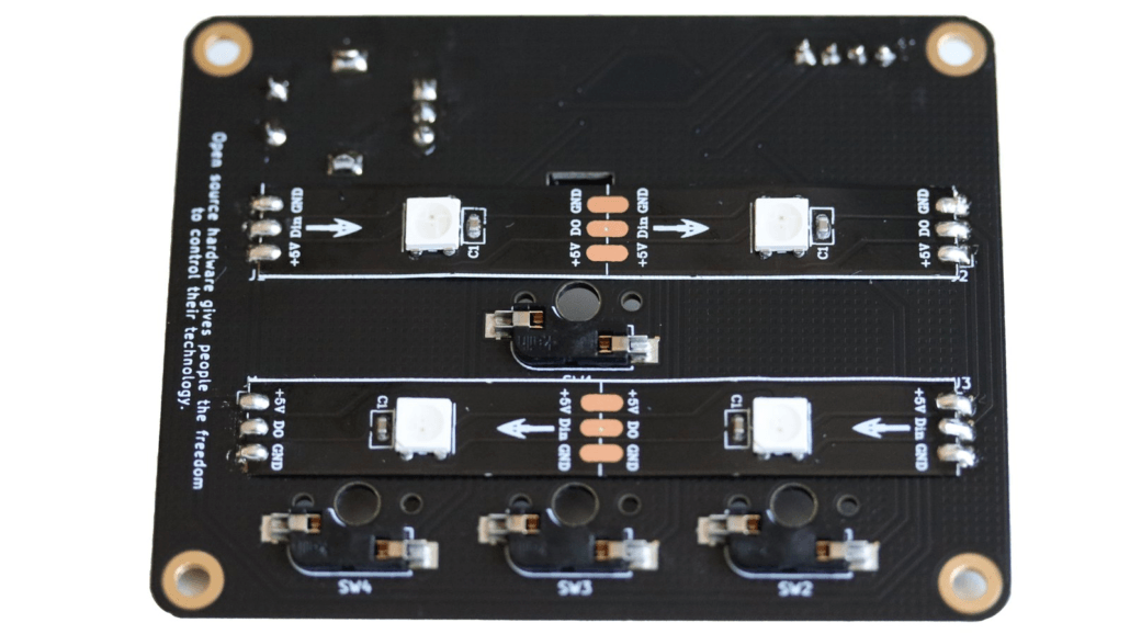 - その他機能 – 各キー上部にRGB LEDを配置。底部照明用に4個のWS2812Bアドレス指定可能LEDを実装