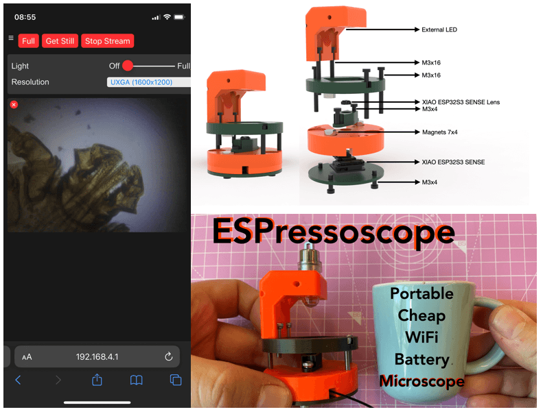 2023年9月、ESPressoscopeと名付けられたこのオープンソース顕微鏡がコミュニティに登場し、新たな変革の兆しを示しました。これはBenedict Diederich氏とVittorio Saggiomo氏によって開発された、エスプレッソカップサイズのXIAO ESP32S3 Sense搭載顕微鏡です。庭でクマムシを観察したり、動物プランクトンやマイクロプラスチックのような他の微粒子を調べたりするのに十分な性能を備えています。まさに画期的な製品です!
