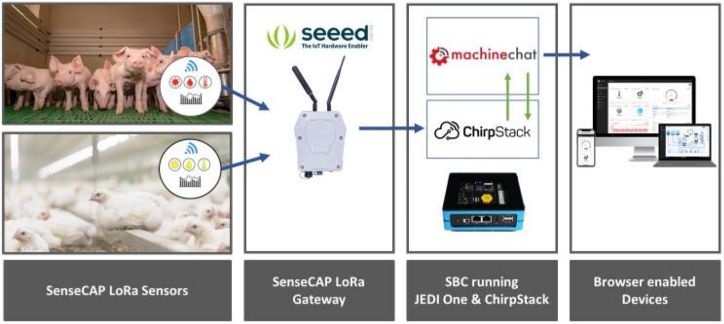 SeedのIIoTデバイス(SenseCAP LoRaWANセンサーとゲートウェイ)により、温度、湿度、光強度、大気質のデータを測定・収集します。このデータは、MachinechatのJEDI OneプラットフォームとChirpStackで動作するローカルサーバーに転送され、統合・可視化されます。これにより、畜産施設の環境条件の変化を継続的に監視できます(図2)。