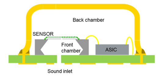 ST社のMP23ABS1のようなボトムポートMEMSマイクロフォンは、音響センサーの真下に入口があり、これにより後室のサイズを最大化します。後室の体積が大きいほど膜がより自由に動くことができ、したがって信号対雑音比(SNR)が向上し、低周波数応答が改善されます。同様に、小さい前室はヘルムホルツ共鳴をより高い周波数に移動させることで高周波数応答を改善します。この構成は最適な性能を提供しますが、欠点もあります。