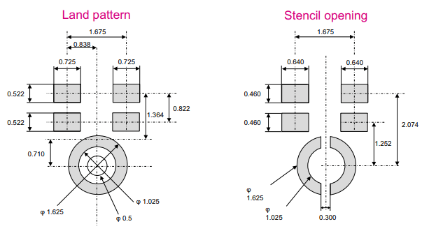 適切に設計されたステンシルを使用した典型的なリフローはんだ付け手順では、はんだが入口に入り込むことはありません。ボトムポートMEMSマイクは、音響ポートを囲む特徴的なリング状のグラウンドパッドによって識別できます。ステンシルの対応する開口部は以下のように設計する必要があります: