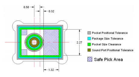 MP34DT01-Mのようなトップポートマイクの場合、危険はピックアンドプレース段階に存在します。ポートは通常部品の中央に配置されていませんが、様々なマシンとパッケージの許容差と手の滑りの可能性により、ピックアンドプレースノズルが入口を通過してデバイスの内部を損傷する可能性があります。したがって、メーカーのデータシートでは多くの場合、指定された安全なピック領域が定義されています。この安全なピック領域を満たすことは、そのような発生を減らすのに役立ちます。代替案として、中央ではなくパッケージの四隅を引く特別に設計されたノズルが最良の保証を提供します。手作業で配置する場合は、代わりにピンセットの使用を検討してください。