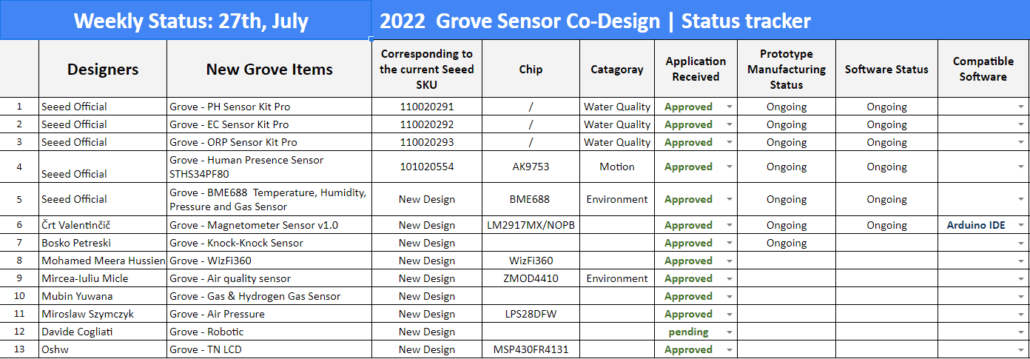 特別なご注意:この表は、現在コミュニティの一部のデザイナーが取り組んでいるGroveセンサーのリストです – 重複を避けるため、以下のGroveセンサーはスキップしていただけます。2022年Groveセンサー共同デザインイベントに参加しているすべてのデザイナーのために、2週間ごとに製造プロセスを同期いたします。