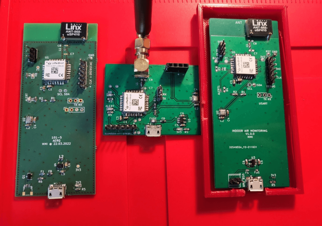このプロジェクトでは、頭脳部としてSTM32WL – Seeed Wio E5を採用し、IAQを取得するためにボッシュBME688をBSEC 2.xライブラリと共に使用しています。内蔵アンテナ版とSMAコネクタ付き版の2種類があり、すべてのボードは4層のカスタムボードを採用しています。