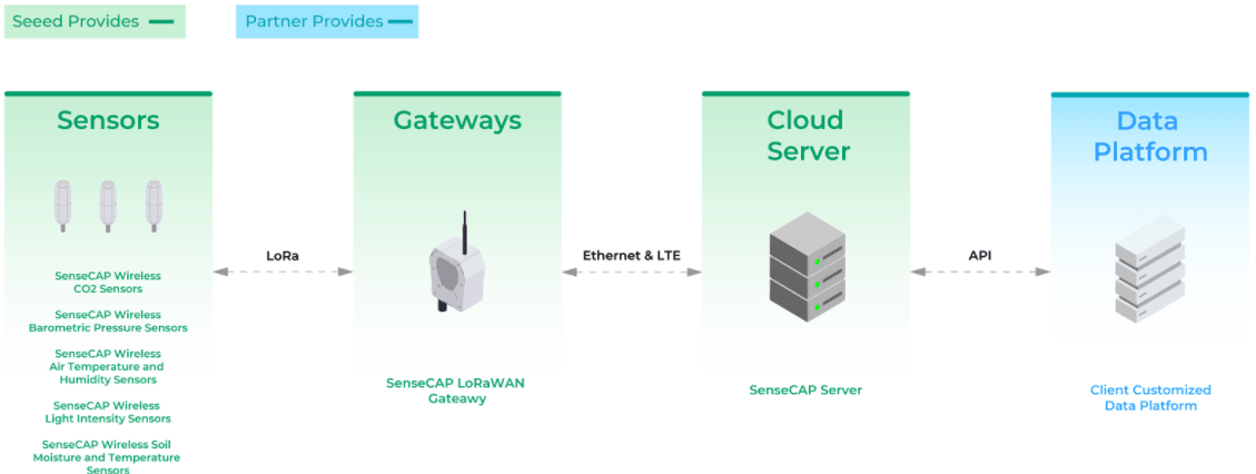 これらの課題を解決するため、鄧氏はSenseCAP LoRaWANシリーズのIIoT製品を活用したスマート農業技術の導入を決めました(図3)。LoRaWANプロトコルに基づくSenseCAPは、複数のISM帯をサポートし、世界中で導入可能です。IP66防水・防塵仕様により、スマート農業のような屋外環境で、低消費電力、長距離通信、長期間のデータ収集が実現できます。
