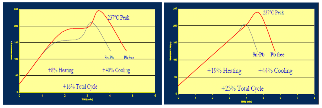 Soak: During the soak phase, the solder paste is given time to expel volatile substances and for flux activation. The typical soak time is between 60 – 120 seconds. If this time is too short, it may lead to insufficient outgassing and oxide reduction, but if it is too long, the flux may become exhausted, both of which can lead to soldering defects. The RTS profile lacks this stage to reduce the amount of time the board is above the PCB’s glass transition temperature which increases the risk of board warpage.