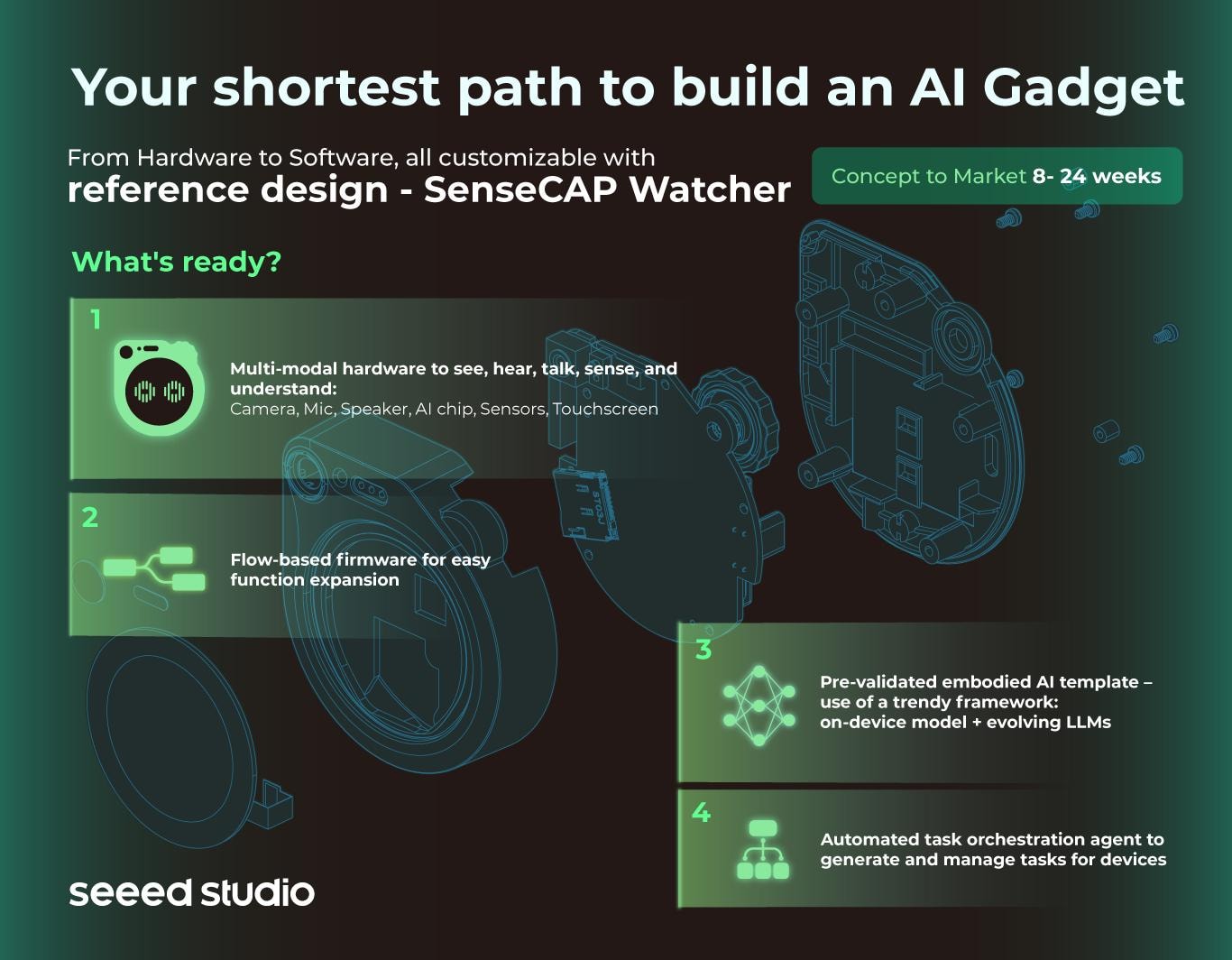 SenseCAP Watcherによって、私たちは物理世界の最前線に強力なLLMをもたらす革命的なフレームワークを開発しました。このフレームワークはAIハードウェアのプロトタイピングを加速します。私たちのカスタマイゼーションサービスにより、これまで以上に迅速にAIハードウェアを実現することができます。