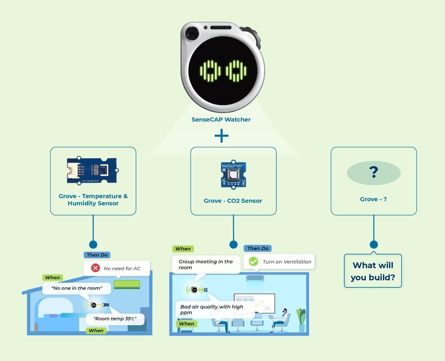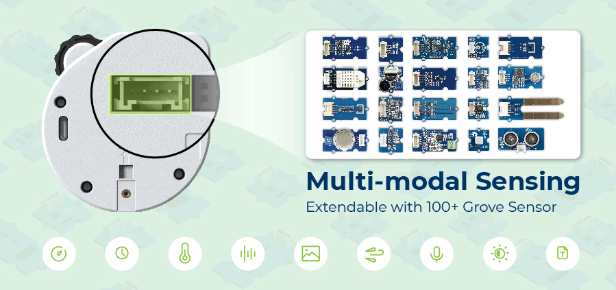 Watcherは視覚センサーに留まらず、マルチモーダルセンサー統合をサポート。デバイス背面の予約I2Cインターフェースは100種類以上のGroveセンサーモジュールと接続可能。このオープンな拡張性により、Watcherは多次元データを融合して総合分析と知的意思決定を行えます。例えば「インテリジェント温度制御」アプリケーション - スーツを着用した人を検出時はエアコンを22°Cに、ショーツ着用時は26°Cに調整。