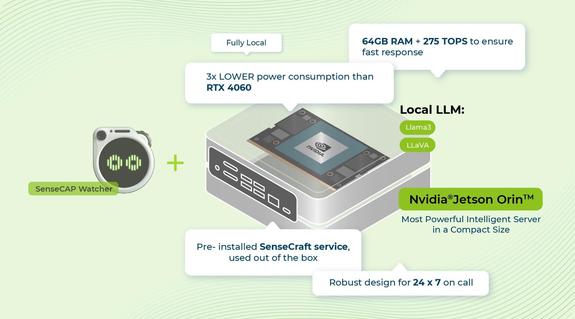 予備コンピューターでSenseCraftローカルサービスを簡単に展開可能。企業級信頼性と超低消費電力を追求する専門応用シーンには、SenseCAP Watcher + NVIDIA® Jetson AGX Orin™最適な組み合わせソリューションをお勧めします!