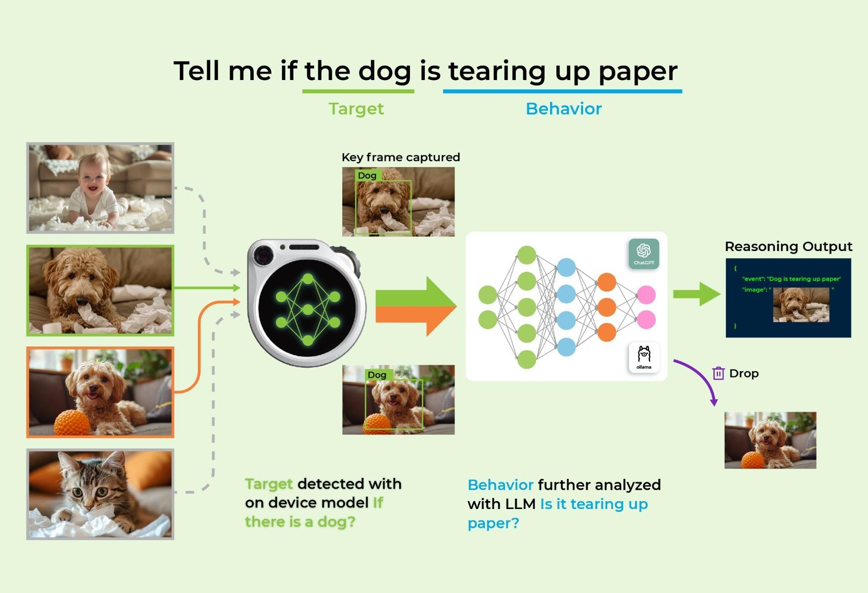 「犬が紙を破っているかどうかの検出」を例に、エッジモデルが犬の存在を識別した時のみ、キーフレームをLLMに送信して行動分析を実行 - 紙を破っているかどうかを確認。人、猫、リスなどの他の目標による誤トリガーを回避し、コストの精密制御を実現します。