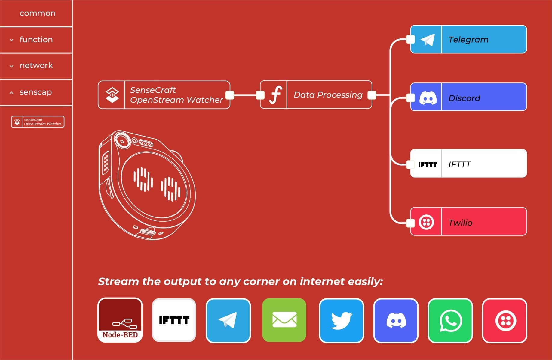 わずか3ブロックで、Node-REDを介してWatcherからの検出結果をインターネット上のどこにでもストリーミングできます。スナップを撮るのと同じくらい簡単です!