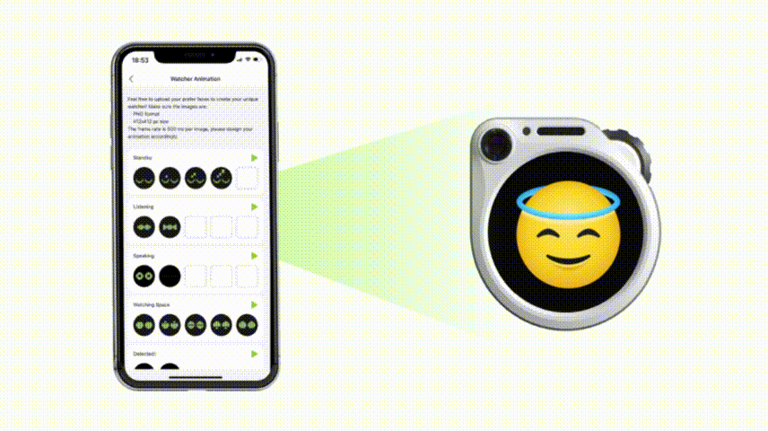 SenseCAP Watcherは直感的な「状態モード」であなたのコマンドに応答。「LISTENING」コマンド状態から「WATCHING」実行状態まで、各モードには専用の視覚表現があります。さらに興奮すべきは、パーソナライズド表情パックをアップロードして、Watcherに唯一無二のパーソナライズド外観を持たせることができる点です。PNG形式の表情ファイルを準備し、数秒でアップロード完了!Watcherを真にあなた専用のインテリジェントアシスタントにしましょう!