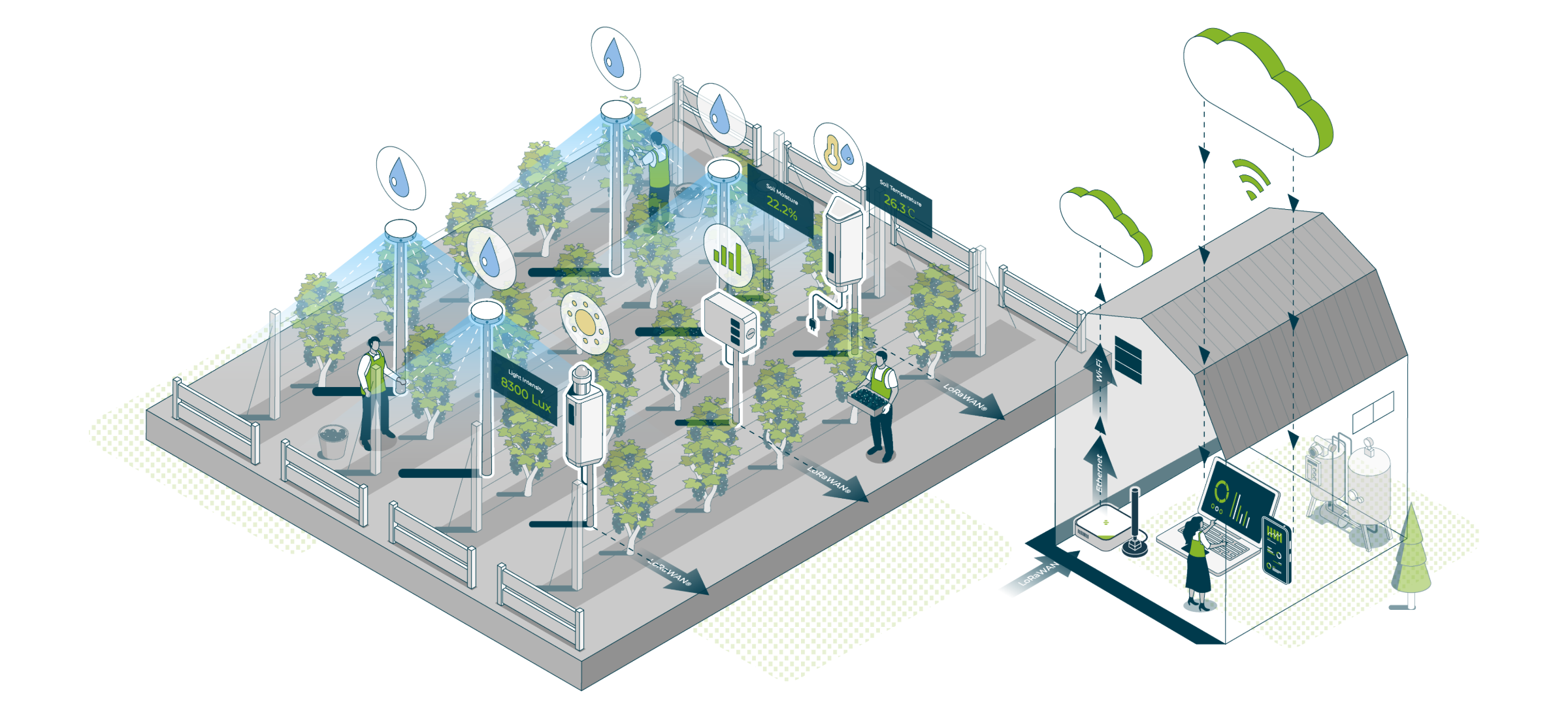 水と肥料の一体管理で、高価値な黒小麦農場の精密管理を支援センサーデータが制御システムと連携し、環境に基づいた精密な灌漑と施肥を実現します。カメラデータと組み合わせて、病害虫対策を講じ、収穫時期を予測することで、作物の収量と品質を向上させます。